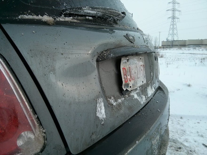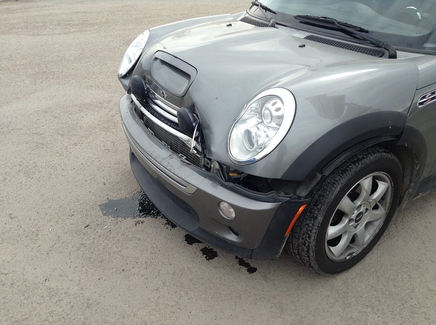 My big accident. A four-car pileup in which I was the fourth car, sliding into a Ford Explorer’s rear end on a gravelly post-winter road. I blame the lack of ABS. I blame the tiny ball-bearing rocks for the slide. But it doesn’t matter.