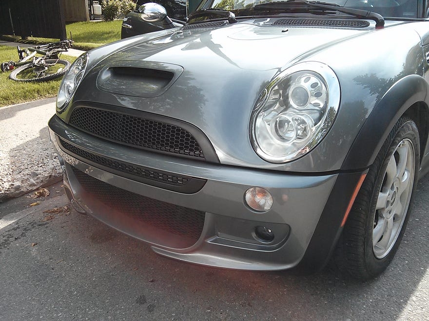 The one good thing to come from this is that I could completely redesign the front end with better parts: the chrome grill seen above was replaced with a black mesh one, and the bottom bumper became the upgraded JCW aero package body kit. I even asked for them to debadge the nose for me (since there’s holes you have to cover and paint, it’s hard to do yourself).also conveniently shown: my clunky high school mountain bike, which I rode everywhere for months.